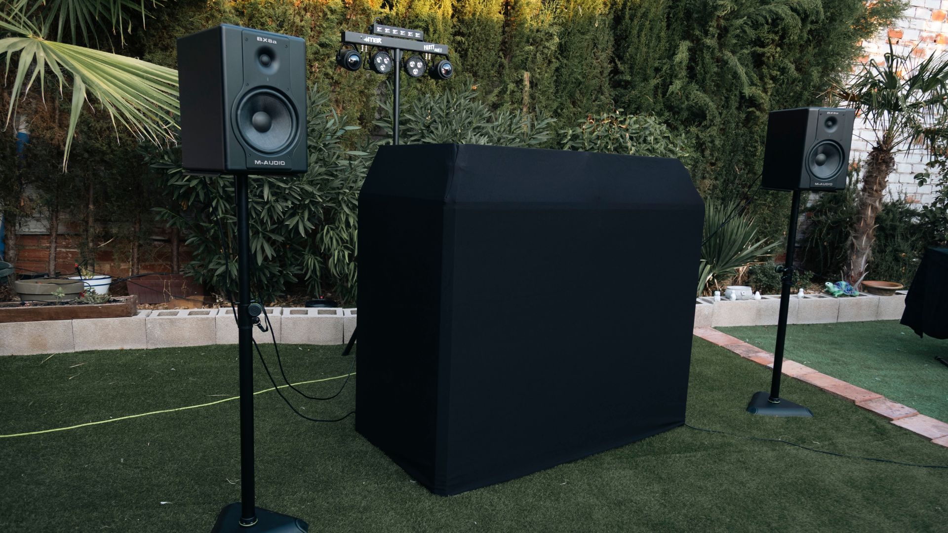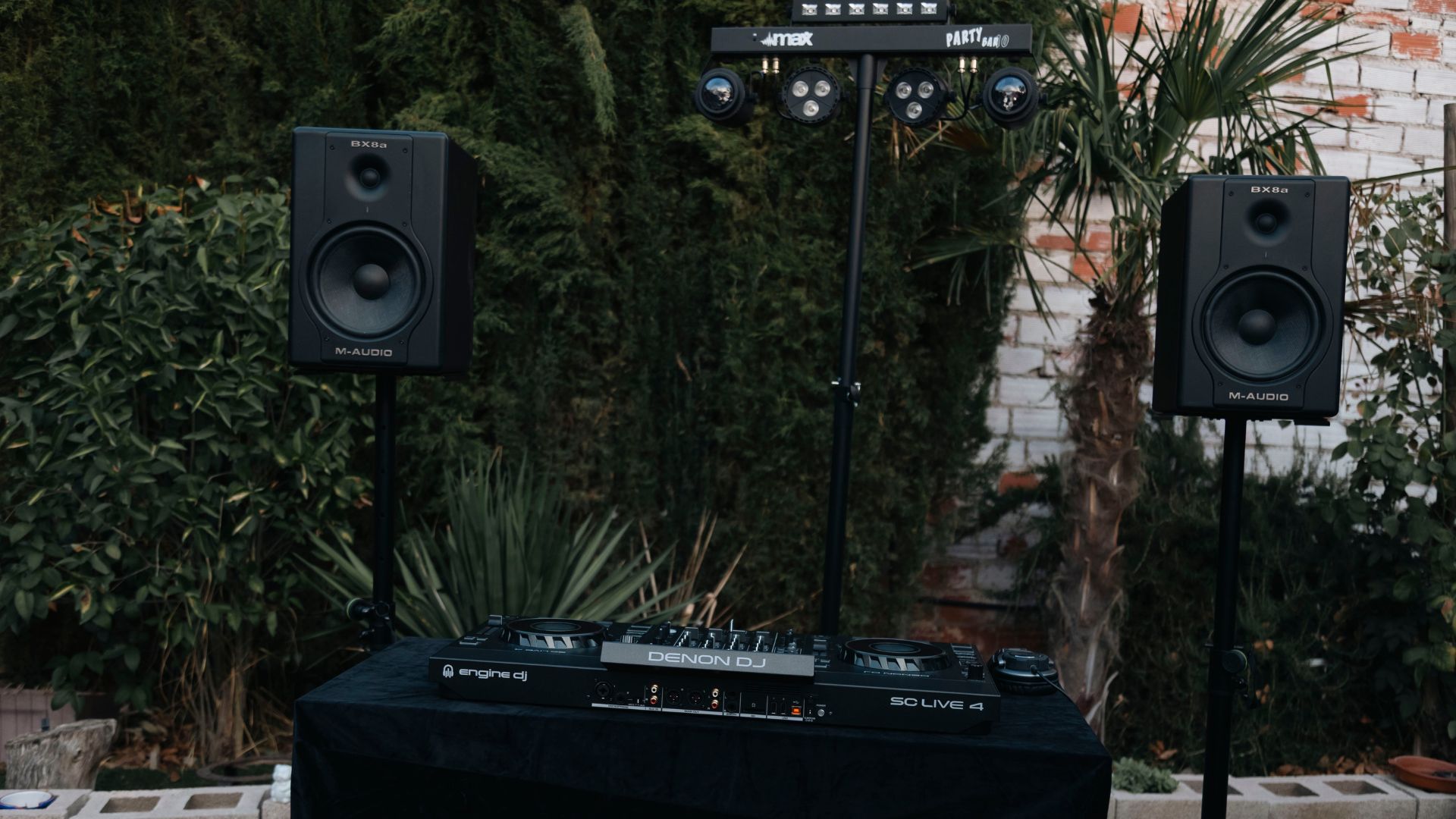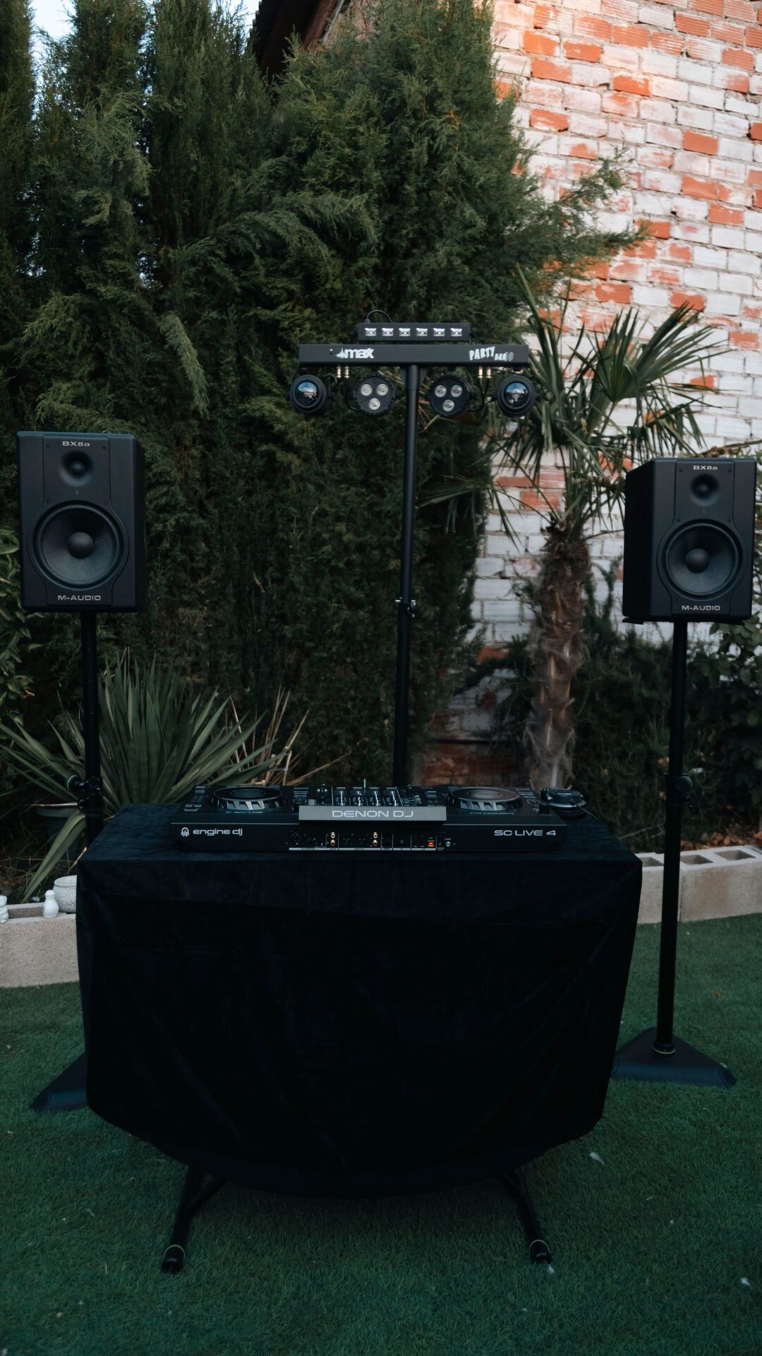 Igualmente, ofrecemos un servicio premium con montaje de cabina de DJ profesional, altavoces de alta potencia, iluminación avanzada y extras como máquina de humo.